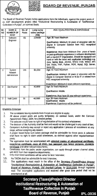 - The applications must reach the office of the Secretary (Taxes), Project Director for Institutional Restructuring & Automation of Tax/Revenue Collection at the Punjab Board of Revenue, Old Anarkali, Lahore, by May 22, 2024, through registered mail.